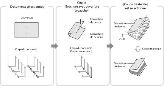 Si un papier d'un grammage entre 80 g/m2 et 105 g/m2 est utilisé pour le corps du document et que le nombre de feuilles dépasse 150, l'épaisseur de la brochure risque d'empêcher la reliure. Dans ce cas, un bourrage papier risque de se produire. Réduire le nombre de pages du corps du document. Veiller à bien définir le type de papier. Sinon, la tâche risque d'être annulée. Veiller à bien définir le format de finition. Un bourrage papier risque de se produire si le format de la couverture remplit l'une des conditions ci-dessous. Coupe : la largeur de coupe du bord avant de la couverture est supérieure à 50 mm. Sans coupe : la longueur du format de finition dépasse la largeur du stacker (environ 297 mm), ou la profondeur du format de finition dépasse la hauteur du stacker (environ 221 mm). |
