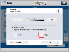 Si la densité de fond est réglée en appuyant sur [Régler] pour <Densité du fond>, le réglage [Auto] est annulé. De même, si on appuie sur [Auto] en réglant la densité manuellement sous [Régler], les réglages sont annulés. La machine règle automatiquement la densité en fonction du fond. |