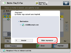 Il est impossible d'imprimer plusieurs fichiers simultanément. Pour ce faire, sélectionner et imprimer les fichiers l'un après l'autre. Si <Verrouillage mémoire I-Fax> est réglées sur "Non", les fichiers reçus via la fonction I-Fax sont automatiquement imprimés et supprimés de la boîte mémoire RX. |