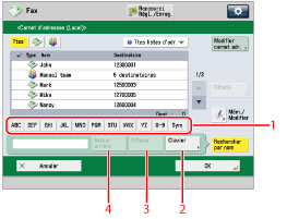 5 | Bouton de recherche par initiale Utiliser les touches alphanumériques (par exemple [ABC]) pour afficher les touches d'accès direct à une lettre ou un chiffre spécifique. Il est possible de sélectionner une lettre ou un nombre afin de restreindre l'affichage des entrées. Appuyer sur [Ttes] pour revenir à la liste complète des adresses. |