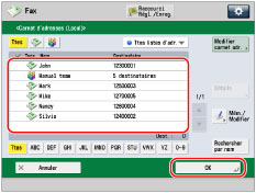 Pour annuler un destinataire sélectionné, le sélectionner une nouvelle fois. Le carnet d'adresses local peut être enregistré et importé à l'aide de l'interface utilisateur distante. (Voir "Chargement des informations réglages (Importer individuellement)".) Si un seul destinataire est sélectionné, appuyer sur pour procéder à l'envoi à partir de l'écran Carnet d'adresses. |
