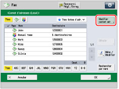 [Modifier carnet adr.] s'affiche uniquement lorsque le carnet d'adresses distant et le serveur LDAP sont enregistrés. Si seul le serveur LDAP est enregistré sur la machine, la mention [Vers Serv. LDAP] s'affiche. |