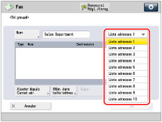 Lors de la définition d'une adresse de groupe, il n'est possible de sélectionner que des destinataires enregistrés dans une même liste d'adresses. |