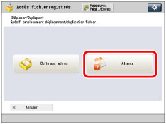 Il est impossible de déplacer ou de dupliquer en file d'attente des fichiers dans la Boîte Fax/ I-Fax ou d'un support mémoire. Le déplacement ou la duplication vers la file d'attente d'un fichier compilé avec [Fusionner plusieurs fichiers] ou [Insérer pages] sous [Modifier fichier] de l'écran Sélection de fichiers est impossible. |