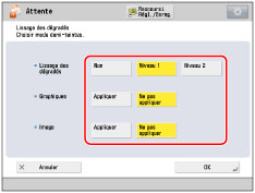 Si plusieurs étendues de pages sont sélectionnées et que les réglages de chaque étendue de pages sont différents, [Mixte] s'affiche pour [Format papier d'impression] et [Chaque partition] ou [Appliquer régl. à chaque partition] s'affiche pour les autres réglages. |