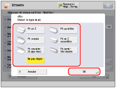 Le mode Piqûre à cheval ne peut être défini que si le mode Impression recto verso est défini. Si le Module de Finition P.A.C.-W1 PRO est installé, un pli cavalier peut être appliqué aux formats de papier suivants : 330 mm x 483 mm, 305 mm x 457 mm, 320 mm x 450 mm (SRA3), A3, B4, A4R, 13" x 19", 12" x 18", 12 5/8" x 17 11/16", 11" x 17", LGL, LTRR ou format personnalisé (210 mm x 279,4 mm à 330,2 mm x 487,7 mm) Si le Module de Finition P.A.C.-T1 est installé, un pli cavalier peut être appliqué aux formats de papier suivants : 305 mm x 457 mm, A3, B4, A4R, 12" x 18", 11" x 17", LGL ou LTRR |