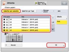 Si l'on appuie sur [Détails], les informations détaillées concernant le papier sélectionné s'affichent. Si on appuie sur , on peut choisir d'afficher ou non l'illustration de périphérique. Pour plus d'informations, voir "Changement de l'affichage par défaut de l'écran de sélection de la liste des papiers ". |