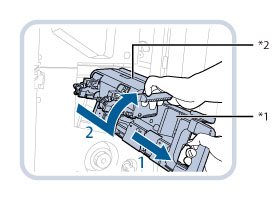 *1 Agrafeuse avec piqûre à cheval *2 Ensemble d'agrafage de l'agrafeuse avec piqûre à cheval | 1. Saisir la poignée de l'agrafeuse avec piqûre à cheval et la tirer vers soi jusqu'à ce qu'elle vienne en butée. |
