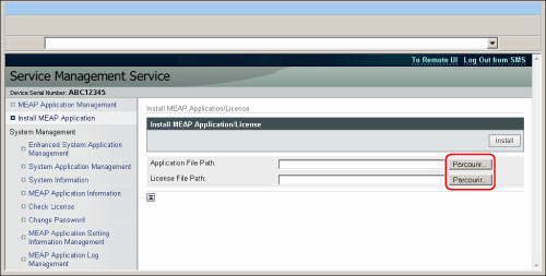 Un fichier de licence valide est nécessaire pour installer une application MEAP. Si l'application est fournie avec un numéro d'accès de licence, accéder au License Management System à l'URL suivante afin d'obtenir un fichier de licence : http://www.canon.com/lms/license/ Suivre les instructions en ligne pour créer et télécharger le fichier de licence. Le numéro d'accès de licence et le ou les numéros de série du périphérique MEAP (affichés au coin supérieur gauche de l'écran SMS) doivent être à portée de main afin de terminer la procédure de génération de licence. Si l'application n'est pas fournie avec un numéro d'accès de licence, le fichier de licence sera proposé par le fournisseur de l'application MEAP. Pour plus d'informations, voir le guide fourni avec l'application. |