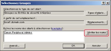 Saisir "Canon Peripheral Admins" dans la boîte de dialogue de sélection du groupe → cliquer sur [Vérifier les noms].