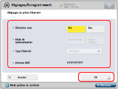 La machine détermine automatiquement le type Ethernet. Appuyer sur [Oui], sauf pour spécifier un réglage Ethernet particulier. |