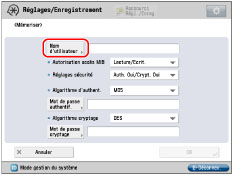 Un utilisateur SNMP v. 3 connecté avec les réglages suivants est enregistré par défaut. Il est possible de supprimer ou de modifier ces réglages. [Nom d'utilisateur]: initial <Autorisation accès MIB>: [Lecture/Ecrit.] <Réglages sécurité>: [Auth. Oui/Crypt. Oui] <Algorithme d'authent.>: [MD5] [Mot de passe authentif.]: initial <Algorithme cryptage>: [DES] [Mot de passe de cryptage]: initial |