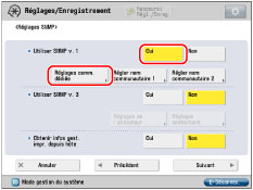 Appuyer sur [Réglages SNMP] pour [Réseau] → spécifier les réglages SNMP v. 1 → appuyer sur [OK].