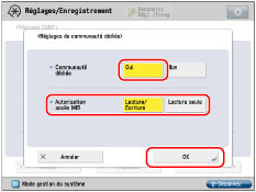 Appuyer sur [Oui] pour <Communauté dédiée> → sélectionner <Autorisation accès MIB>.