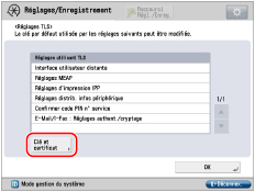 Appuyer sur [Réglages TLS] pour [Réglages TCP/IP] → [Clé et certificat].