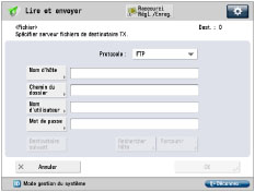 "Envoi de données".Dans certains environnements, des réglages détaillés peuvent être nécessaires pour pouvoir utiliser FTP. Pour plus d'informations, consulter l'administrateur du réseau utilisé.
