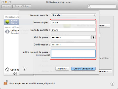 Dans la fenêtre [Comptes]/[Utilisateurs et groupes], saisir le nom de l'utilisateur auquel les données doivent être envoyées depuis la machine via Mac OS X → saisir le mot de passe.