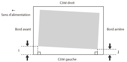 Si l'image imprimée est penchée, l'utilisateur peut corriger l'erreur d'alignement de l'image en justifiant les marges de "i", qui est la distance entre le côté gauche de la feuille et la zone d'impression, et "j".