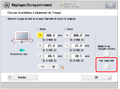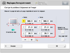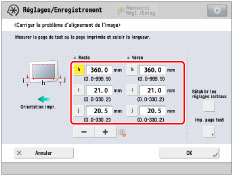 Pour restaurer la valeur cumulée, appuyer sur [Rétablir les réglages initiaux]. Si les repères s'impriment sur le papier de sortie, la zone imprimée est égale à la zone à l'intérieur des repères. |