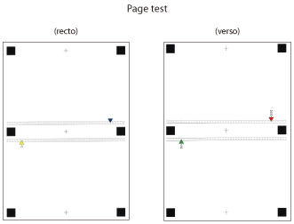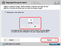 Plus le nombre de pages de test imprimé est important, plus le réglage est précis. Si on spécifie plusieurs pages de test de sortie, s'assurer que toutes les pages de test sont lues dans l'ordre où elles sortent. Si l'ordre est modifié ou si le processus de lecture n'est pas effectué successivement, il est impossible d'effectuer le réglage correctement. |