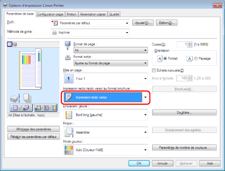 Sélectionner [Impression recto] ou [Impression recto verso] dans [Impression recto/recto verso/au format brochure].