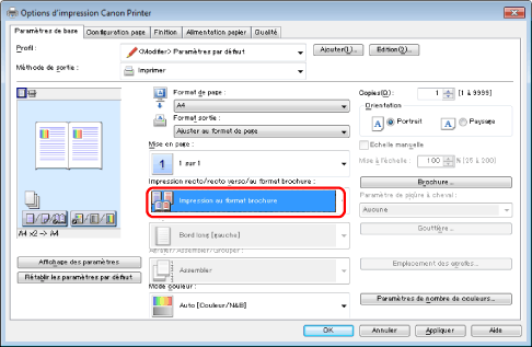 Sélectionner [Impression brochure] dans [Impression recto/recto verso/au format brochure].