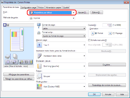 S'il n'est pas possible de choisir un profil, accéder à la boîte de dialogue des propriétés de l'imprimante à partir du [Panneau de configuration], cliquer sur l'onglet [Profil], puis vérifier si les options [Autoriser la sélection de profils] et [Autoriser la modification des paramètres] sont sélectionnées. Pour plus d'informations sur l'accès à la boîte de dialogue des propriétés de l'imprimante, voir " Définition des options de l'imprimante". L'affichage peut varier en fonction du système d'exploitation, ainsi que du type et de la version du pilote d'impression. |