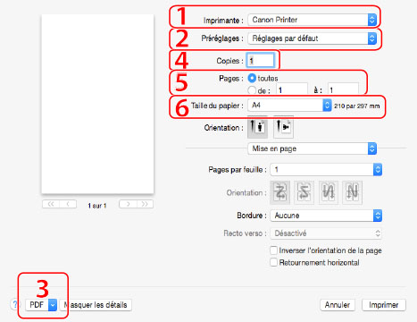 3. PDF | Pour enregistrer le document sous forme de fichier PDF. | 4. Copies | Pour spécifier le nombre de copies à imprimer. |