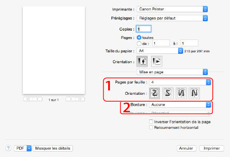 1. Mise en page | Pour imprimer plusieurs pages sur une seule feuille (voir "Impression de plusieurs pages sur une seule feuille"). | 2. Bordure des pages | Permet d'imprimer chaque page avec une bordure. |