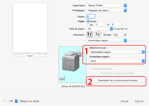 1. Alimentation papier | Pour imprimer sur un type de papier spécifique, indiquer la source contenant le papier approprié ou le type de papier. | 2. Couvertures de dessus/dessous | Permet d'utiliser du papier d'un type différent de celui utilisé pour les pages principales, en vue de créer des couvertures de dessus/dessous. |