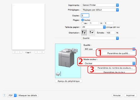Les paramètres disponibles peuvent varier en fonction du système d'exploitation et de l'application, ainsi que du type et de la version du pilote d'imprimante. Si vous utilisez Mac OS X 10.7 ou une version ultérieure, cliquez sur [Afficher les détails]/[Masquer les détails] au bas de l'écran pour afficher ou masquer les options. Si vous utilisez Mac OS X 10.6, cliquez sur [ ] à droite d'[Imprimante] pour afficher ou masquer les options. |