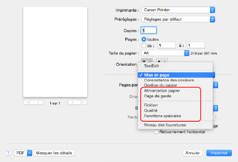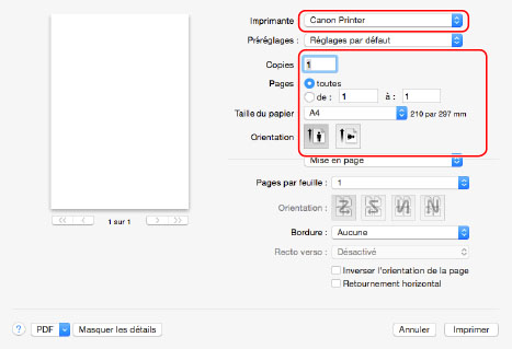 Si vous utilisez Mac OS X 10.7 ou une version ultérieure, cliquez sur [Afficher les détails]/[Masquer les détails] au bas de l'écran pour afficher ou masquer les options. Si vous utilisez Mac OS X 10.6, cliquez sur [ ] à droite d'[Imprimante] pour afficher ou masquer les options.Si la taille de papier requise ne s'affiche pas dans [Taille du papier], il est possible d'en enregistrer une nouvelle (voir "Définition de tailles de papier personnalisées"). Si les fonctions ci-dessus ne peuvent pas être définies dans la partie supérieure de la boîte de dialogue [Imprimer], il est possible de les afficher et de les définir dans le panneau de préférences [Copies et pages] ou dans la boîte dialogue [Format d'impression]. |