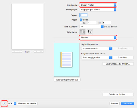 Sélectionner l'imprimante dans [Imprimante] → sélectionner l'un des panneaux de préférences → cliquer sur [