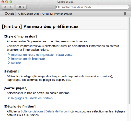 L'aide fournit des informations complémentaires sur chacune des options d'impression. Consultez-la si vous ne trouvez pas les informations souhaitées dans ce manuel.
