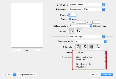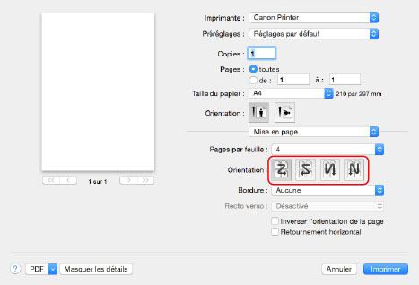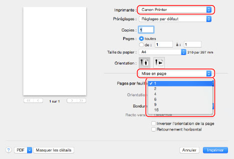 Sélectionner l'imprimante utilisée → [Mise en page] → définir le nombre de pages à imprimer sur une seule feuille dans [Pages par feuille].