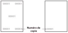 Si le mode Finition est réglé sur [Tri gpé+rotation], [Tri gpé+décalage] ou [Tri gpé+agrafage], [Tri séq.+rotat.], [Tri séq.+décal.] ou [Tri séq.+agraf.] est spécifié. Noter que si le réglage de la position d'impression place les chiffres des numéros de copie en dehors de la zone imprimable, les données concernées ne seront pas imprimées. |