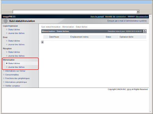 Les 100 dernières tâches sont affichées dans le journal des tâches. La boîte de dialogue qui apparaît à l'enregistrement du journal des tâches au format CSV varie en fonction du fabricant et de la version du navigateur Web. |