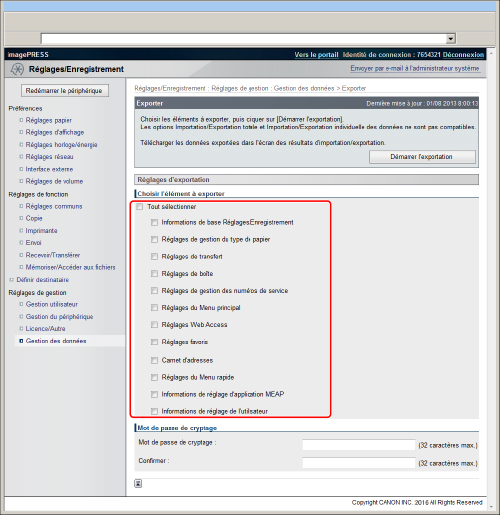 Si l'on importe les réglages de gestion des numéros de service avec la fonction Importer tout, les réglages des informations sur l'administrateur système telles que le nom d'utilisateur ou le mot de passe sont écrasés. Vérifier ces informations sur la machine pour l'exportation avant d'utiliser la fonction Exporter tout, car il faut se connecter à la machine de destination pour pouvoir importer. La fonction Exporter tout n'est pas disponible dans les situations suivantes : Pendant l'exécution/l'attente d'une tâche (envoi, transfert, réception de I-Fax et impression de rapports, fonctions spécifiées en mode Envoi différé) Pendant une opération Importation/Exportation individuelle Pendant la consultation du carnet d'adresses avec l'interface utilisateur distante depuis une autre machine de la série imagePRESS Pendant la distribution des informations périphérique Pendant l'erreur Sauvegarde des données de boîte aux lettres |