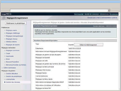 L'écran Résultats d'Importation/Exportation ne s'affiche que quand l'exportation est terminée. Il est possible de télécharger les fichiers d'exportation en cliquant sur [Début du téléchargement]. Il est également possible de vérifier les derniers résultats d'importation/exportation en appuyant sur [Gestion des données] sous <Réglages de gestion> → [Résultats d'Importation/Exportation]. |