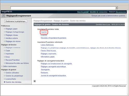 Si l'on importe les réglages de gestion des numéros de service avec la fonction Importer tout, les réglages des informations sur l'administrateur système telles que l'ID ou le mot de passe sont écrasés. Vérifier ces informations sur la machine pour l'exportation avant d'utiliser la fonction Exporter tout, car il faut se connecter à la machine de destination pour pouvoir importer. La fonction Importer tout n'est pas disponible dans les situations ci-dessous : Pendant l'exécution/l'attente d'une tâche (envoi, transfert, réception de I-Fax et impression de rapports, fonctions spécifiées en mode Envoi différé) Pendant une opération Importation/Exportation individuelle Pendant la consultation du carnet d'adresses avec l'interface utilisateur distante depuis une autre machine de la série imagePRESS Pendant la distribution des informations périphérique Pendant l'erreur Sauvegarde des données de boîte aux lettres |