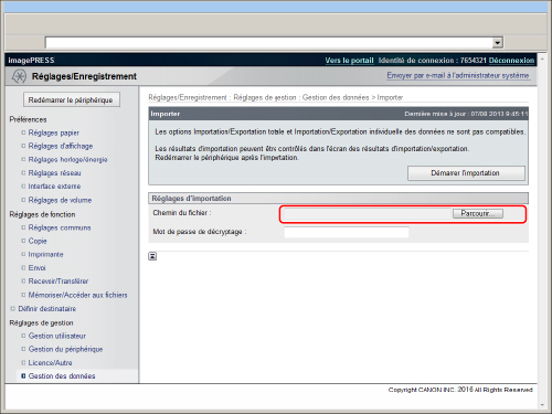 Il faut impérativement redémarrer la machine pour activer les réglages importés. Après l'importation, l'interface utilisateur distante n'est pas utilisable pour effectuer des opérations avant le redémarrage de la machine. Placer l'interrupteur principal de la machine sur Arrêt et remettre la machine sous tension. (Voir "Interrupteur principal et touche d'économie d'énergie".) |