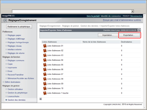 Cliquer sur [Listes d'adresses] pour <Importation/Exportation individuelle> → [Exportation...].