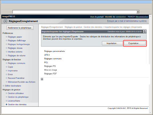 Cliquer sur [Réglages d'imprimante] pour <Importation/Exportation individuelle> → [Exportation...].