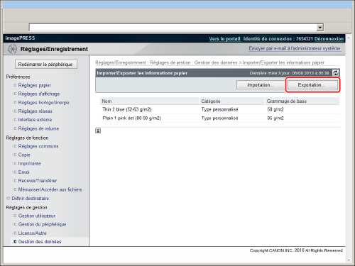 Cliquer sur [Informations sur le papier] pour <Importation/Exportation individuelle> → [Exportation...].