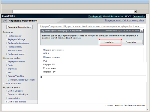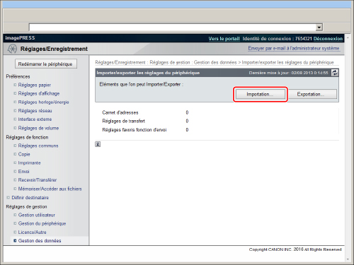 Si l'on importe une Liste d'adresses (Supprimer et remplacer) ou les réglages de transfert, les informations stockées sous [Réglages favoris] à partir du panneau de commande de la machine et la fonction Rappel sont supprimées. |