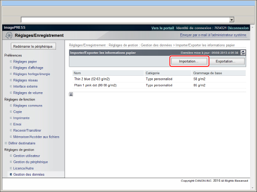 Lors de l'importation, les favoris du fichier informatique écrasent ceux de la machine. Lors de l'importation d'un fichier, utiliser le même format de fichier que les données exportées. Les données d'un format différent ne peuvent pas être importées. |