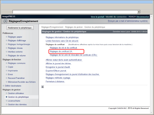 Cliquer sur [Réglages/Enregistrement] → [Gestion du périphérique] pour <Réglages de gestion>.
