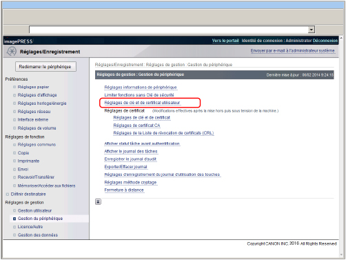 Cliquer sur [Réglages de clé et de certificat utilisateur].