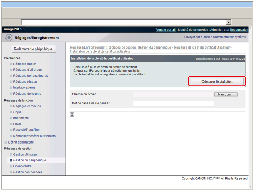 Cliquer sur [Installer...] → saisir le chemin pour la paire de clés et le fichier de certificat à installer, ainsi que le mot de passe de la clé privée → cliquer sur [Démarrer l'installation.].