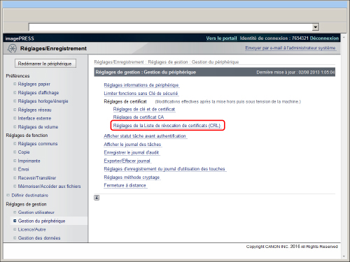 Cliquer sur [Réglages de la Liste de révocation de certificats (CRL)].